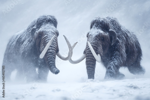 mammoth, woolly, animal, animal, beast, creature, prehistoric, extinct, elephant, mammal, wildlife, nature, fighting, fight, duel, battle, combat, confrontation, clash, facing, struggle, conflict, dominance, power, strength, snow, snowy, winter, blizzard, winter storm, storm, cold, ice, glacé, arctic, tundra, landscape, weather, climate, ice age, pleistocene, tusk, tusk, ivory