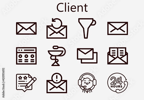 Premium set of client [S] icons. Simple client icon pack. Stroke vector illustration on a white background. Modern outline style icons collection of Operator, Funnel, Mail, Rate, Pharmacy, Mails