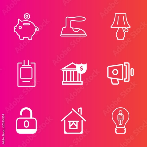 Premium set with outline vector icons. Such as building, security, economy, home, open, household, unlock, clothes, creative, lamp, loud, loudspeaker, bank, domestic, desk, concept, estate, house, pig