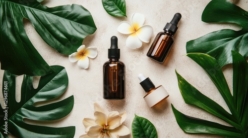 Premium skincare products displayed with natural elements like green leaves and flowers.