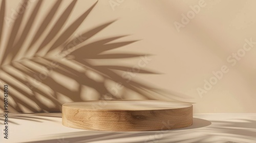 Premium wooden podium with palm leaf shadow on beige background for product showcase.