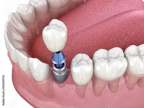 Premolar tooth recovery with implant. Medically accurate 3D illustration of human teeth and dentures concept