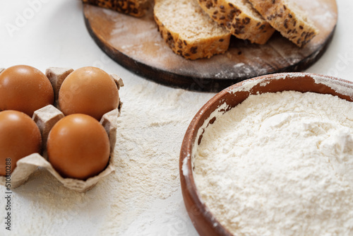 Preparation for baking. Eggs and flour on white background