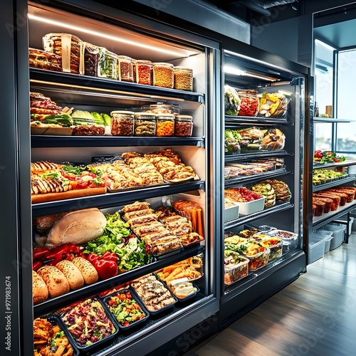 food, eatery, cafes, display, case, refrigerator, refrigerated, prepared, meal, ready, to, eat, catering, take-away, counter, grocery, shop, market, deli, sandwich, salad, baguette, pastry, appetiser, snack, fresh, ingredient, healthy, organic, epicure, produce, vegetable, herb, meat, chicken, cookery, dining, kitchen, interior, commercial, business, retail, industry, service, convenience, modern, clean