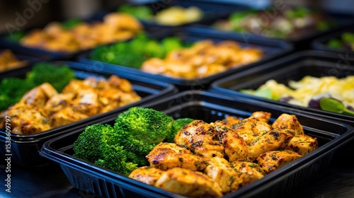 Prepared meals in black containers, featuring chicken, broccoli, and other sides