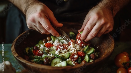 Preparing a fresh garden salad with tomatoes, cucumbers, and feta cheese in a rustic kitchen setting