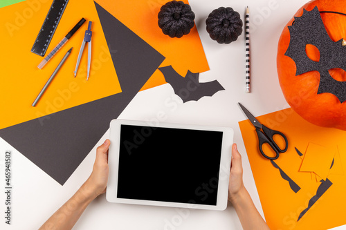 Preparing for Halloween. Teenage kid hands holding digital tablet computer. Colored paper, scissors, pumpkin, Halloween party decorations on white desk. Top view