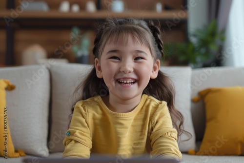 Preschool girl on couch smiling talking on video call with parents using webcam