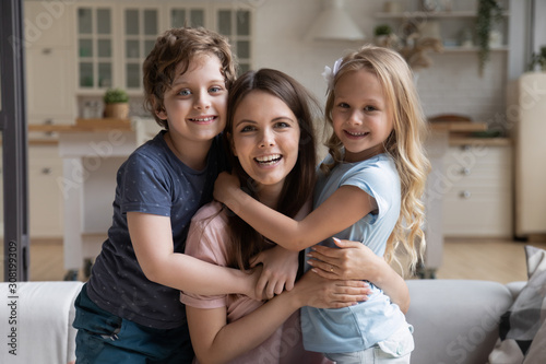 Preschool kids hugging beautiful mother family sitting on couch