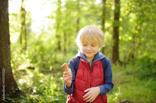Preschooler child pick the edible mushroom during walk in the forest with his parent. Glad boy having fun during forest hike