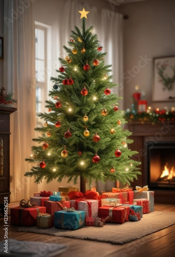 Presents under a small Christmas tree create a cozy atmosphere, festive decor, twinkle lights