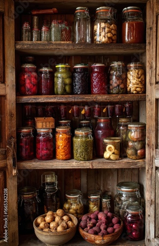 rustic, traditional, fruit, vegetable, colourful, pantry, storage, homemade, canning, pickled, preserved, jar, shelf, food, kitchen, vintage, old, home, healthy, organic, natural, tradition, lifestyle, autumn, winter, harvest, preserving, pickle, jam, cupboard