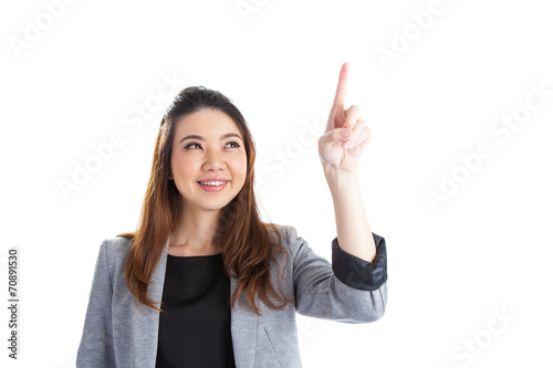 adult, advertisement, asian ethnicity, beautiful, business, businesswoman, caucasian, cheerful, communication, computer monitor, concept, copy space, cut-out, expertise, female, gesticulate, happiness, human finger, human hand, idea, isolated, looking, open, people, pointing, portrait, professional occupation, pushing, signs, studio shot, suit, teaching, technology, touching, white, white background, woman, working, young adult, showing, face, fresh