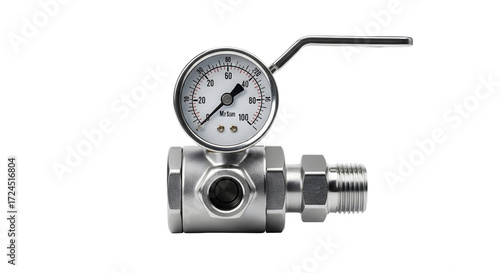 Pressure gauge and valve isolated on transparent background, a vital component in industrial machinery for precise monitoring and control of fluids