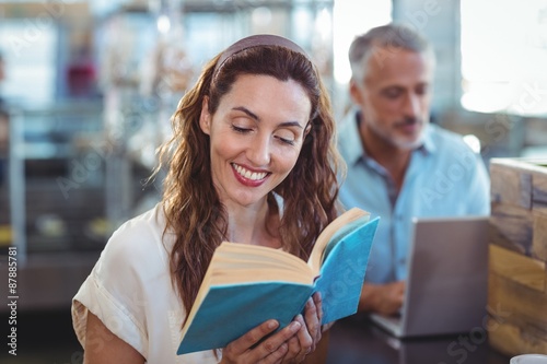 woman, female, caucasian, mature adult, man, male, long hair, brunette, brown hair, happy, smiling, cheerful, bakery, store, standing, posing, cafes, fresh, food, hot drink, cup, book, reading, page, novel, holding, intellectual, literature