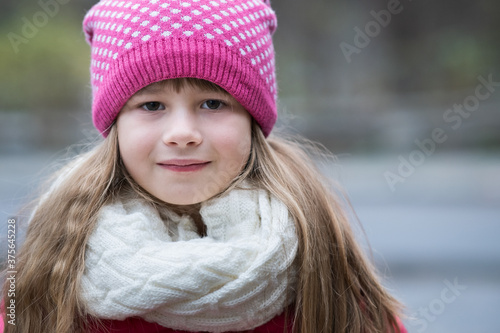Pretty child girl in warm knitted winter clothes outdoors.