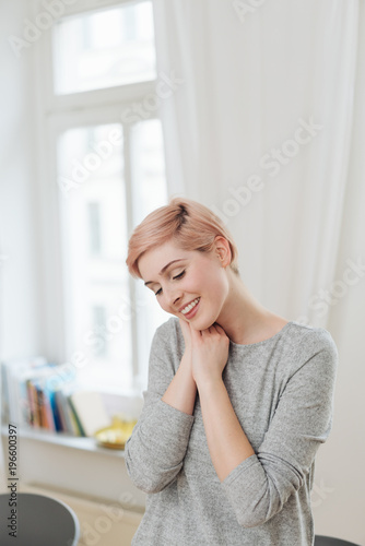woman, calm, elegant, joy, serene, achievement, adult, apartment, attractive, beauty, blond, celebrate, colours, deal, domicile, emotion, emotional, excited, eyes closed, female, feminine, fun, gesture, gesticulate, girl, good news, haircut, hand, happiness, happy, home, indoor, interior, lady, pastel, portrait, room, rose, satisfied, short hair, smile, success, wall, white
