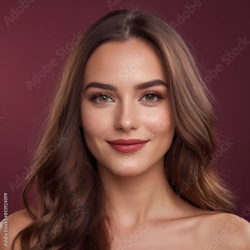 Pretty european beauty woman long hair with makeup glowing face and healthy facial skin portrait smile on isolated burgundy background