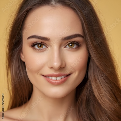 Pretty european beauty woman long hair with makeup glowing face and healthy facial skin portrait smile on isolated light yellow background