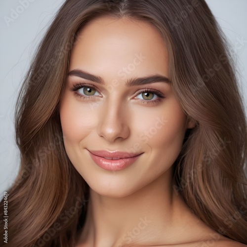 Pretty european beauty woman long hair with makeup glowing face and healthy facial skin portrait smile on isolated white background