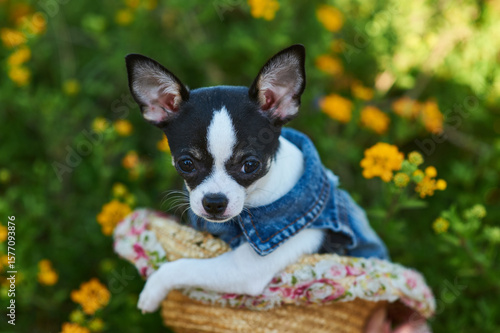 Pretty funny dog toy terrier in hat near the flowers in park