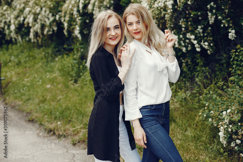 Pretty girls in a summer park. Friends walking in a city. Ladies with blonde hair