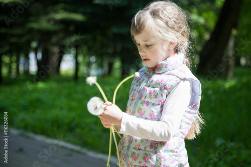 Pretty little girl holding dandelions