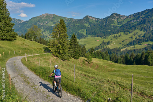 pretty senior woman riding her electric mountain bike on the mountains above Oberstaufen with Nagelfluh mountain chain in background, Allgau Alps, Bavaria Germany