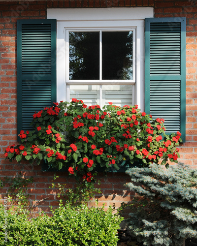 window, frame, shutter, flower, flowerbox, red, shrub, shrubbery, bush, brick, home, house, residential, green, sunshine, sunny, sunlight, shade, shadow