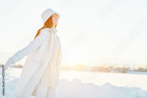 pretty woman in a white coat in a hat winter landscape walk travel
