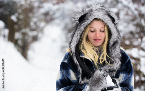 Pretty woman in stylish clothing with snowball in hands. Smiling girl in warm wear playing with snow in winter park. Beautiful woman in plaid coat, fur hat and mittens. Winter holidays and vacation.
