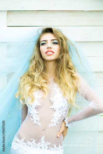 woman, pretty, bride, veil, blond, white, blue, glamour, fashion, fashionable, blond, long hair, young, wedding, party, sexy, desire, girl, female, wooden, smiling, happy