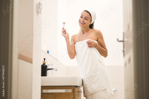 female, woman, young, adult, home, pretty, cute, lifestyle, femininity, domestic, well-being, beauty, one person, make up, face, brush, cosmetic, towel, contented, good mood, beautiful, beaming