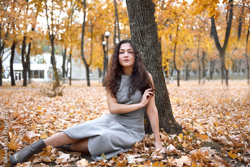 woman, girl, autumn, to sit, leaf, yellow, bunch, city, park, maple, leaf, young, posing, tree, 1, nature, season, day, european, caucasian, hispanic, latin, fall, light, lifestyle, beautiful, happiness, person, long hair, grey, dress