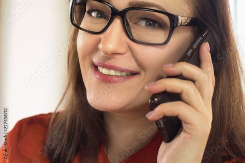 Pretty woman making phone call. Close up portrait of beautiful young business lady wearing glasses having conversation on phone and smiling.