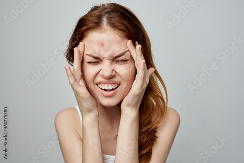 pretty woman with a pimple on the face isolated background