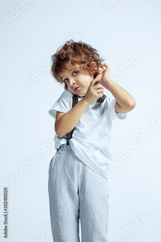 Pretty young boy in casual clothes on white studio background. Fashionable posing, looks confident. Caucasian male preschooler with bright facial emotions. Childhood, expression, having fun.
