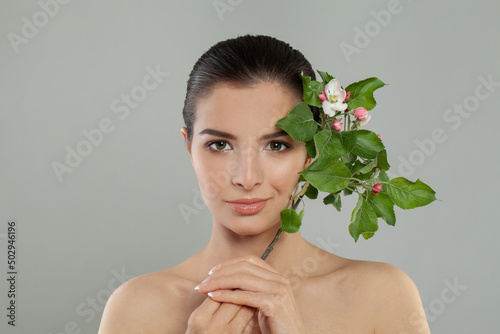 Pretty young brunette woman posing with spring flowers and green leaves over grey wall background