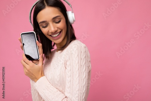 Pretty young brunette woman wearing pink casual sweater isolated over pink background wall wearing white bluetooth wireless headphones and listening to good music and showing mobile phone with empty