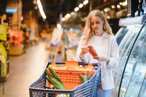 pretty young buying frozen fish, groceries in a supermarket, mall, grocery store