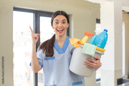 pretty young model feeling like a happy and excited genius after realizing an idea. housekeeper concept
