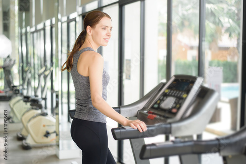 Pretty young sport woman is running on treadmill in gym, Healthy lifestyle
