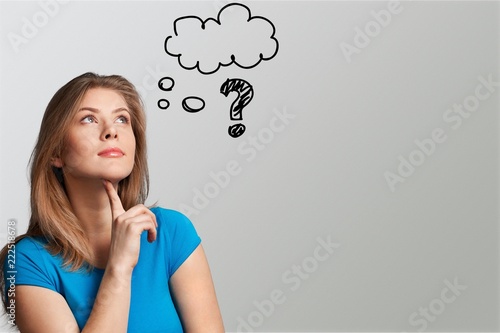 young, pretty, woman, thoughtful, table, white, background, space, isolated, beautiful, happy, person, 1, girl, female, adult, people, beauty, cheerful, portrait, cute, caucasian, smile, hair, life, face, black, eye, fashion, idea, lifestyle, looking, pensive, lady, thinking, attractive, casual attire, serious, gorgeous, sorrowful, sad
