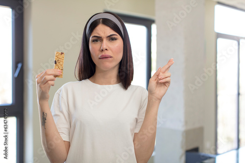 pretty young woman crossing fingers and hoping for good luck. fitness cereal bar concept