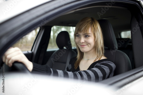 Pretty young woman driving her new car