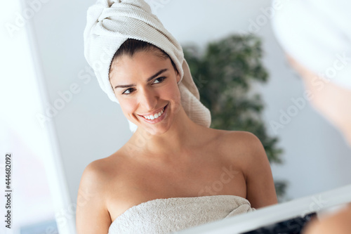 Pretty young woman with perfect smile just out of the shower looking herself in the mirror at home.