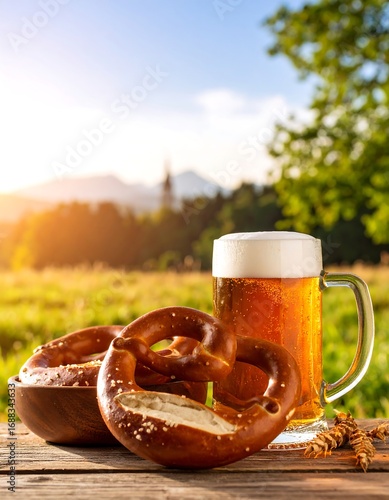 Pretzel and beer against a beautiful summer landscape