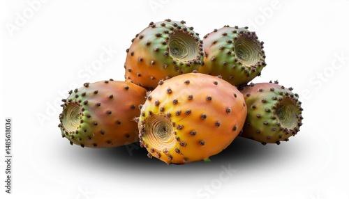 prickly pear, fruit, exotic fruit, tropical fruit, health food, fresh, ripe, sweet, delicious, edible, vegetarian, vegan, raw, diet, nourishment, antioxidant, vitamin, fiber, natural, organic, food photography, still life, closeup, isolated, white background, studio shot, colourful, vibrant, orange, green, spiky, textured, unique, unusual, botany, botanical, plant, nature, mediterranean, sicilian, ingredient, culinary, gastronomy
