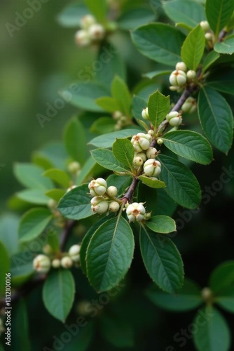 Prickly shrub with dark green leaves and white berries in full bloom, spring, flowers, wildflowers