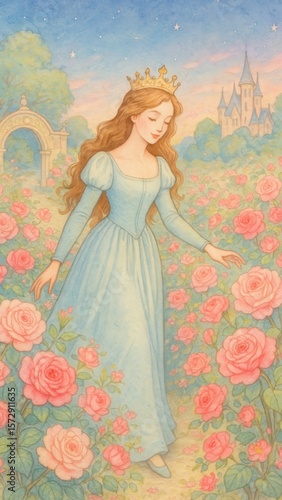garden, rose, illustration, princess, background, texture, pastel, art, colours, watercolor, wallpaper, vintage, floral, crown, blue, pink, sky, person, landscape, accessory, mediaeval, painting, drawing, fantasy, scenery, castle, yellow, fairy, face, set, shoe, magical, whimsical, realistic, clothing, detail, walking, design, cream, human, scene, head, enchanted, fairy tale